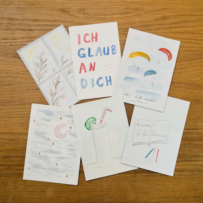 Du bekommst eine von mir handgemalte Aquarell-Postkarte – inspiriert von einem meiner Flashback Songs + Download des jeweiligen Songs.